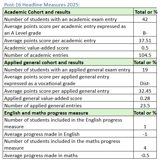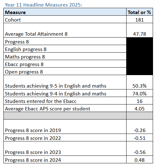 Data source: SISRA analytics data collaboration (no Gov.uk data at time of writing) During the summer of 2025, students completed formal KS4 and KS5 examinations. The school has completed internal analysis of the results obtained by last year's KS4 and KS5 students. Official performance figures for the academic year 2024-2025 will be provisionally published in Autumn 2025 with a further revised publication due February 2026. The Covid-19 pandemic had an impact on school and college performance data, therefore 2020 and 2021 are not included in the tables above. Additionally, no Progress 8 will be published in relation to 2025 and 2026 summer examination results.